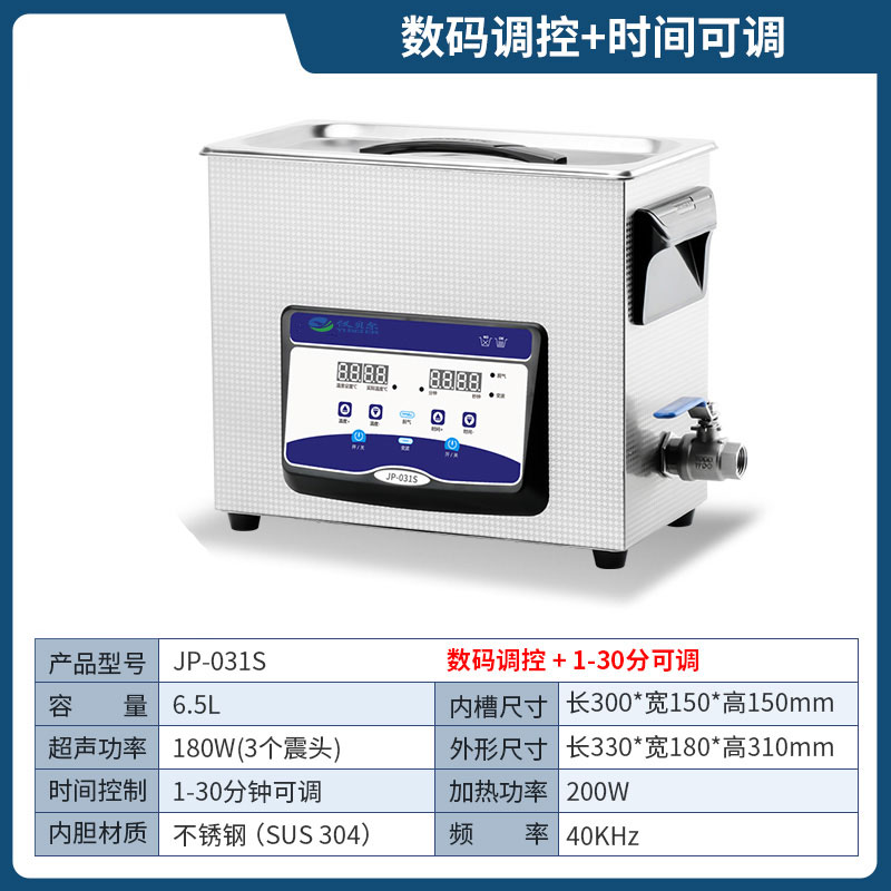 031S台式超声波清洗机JP列功率可调型超声波清洗器适用于各种五金件精密零件,冲压零件等工厂企业小批量清洗科力超声波清洗器可应用于各种精密零件脱脂除锈清洗,配备工业型40台式超声波清洗机KHz、高效超声波换能器,超声波清洗机容量从3.2L -30L多种规格可选。