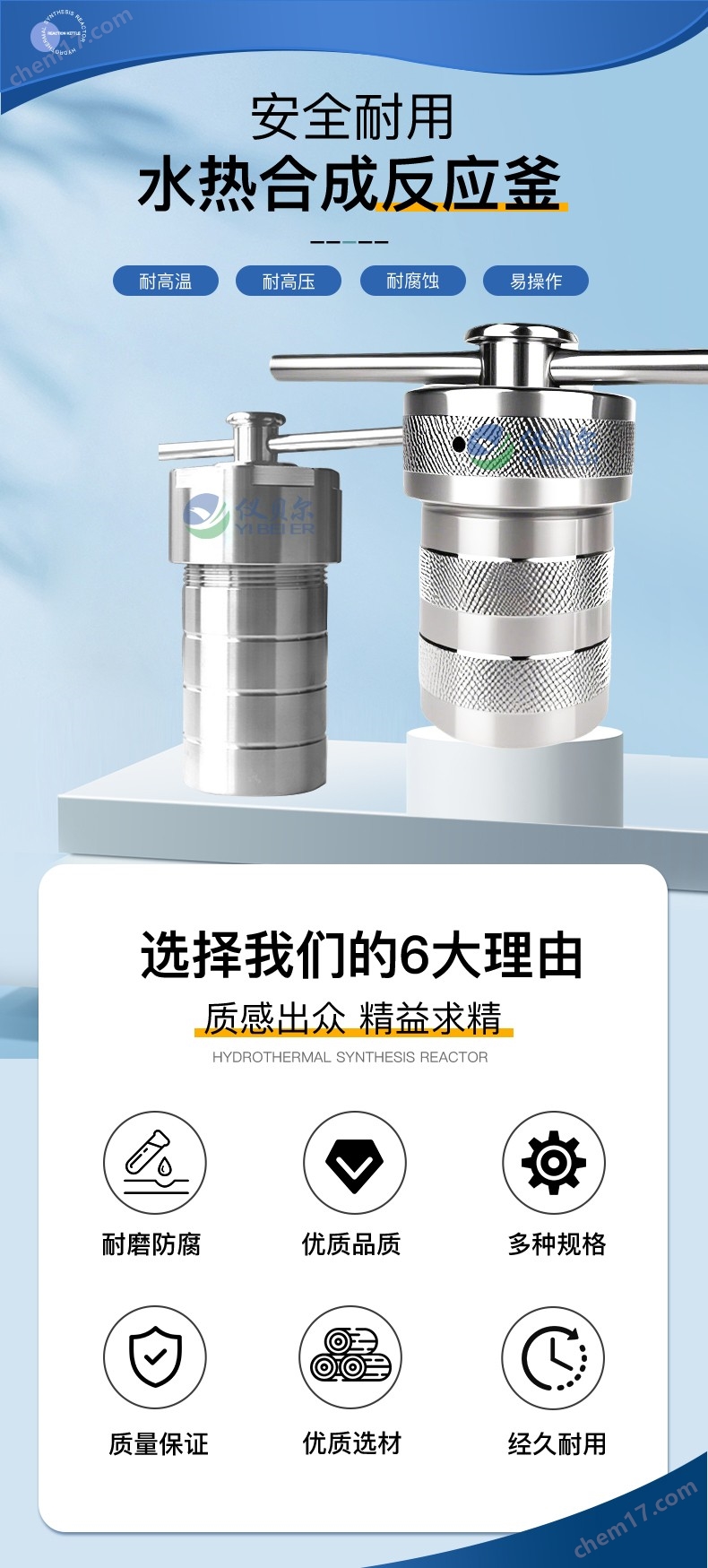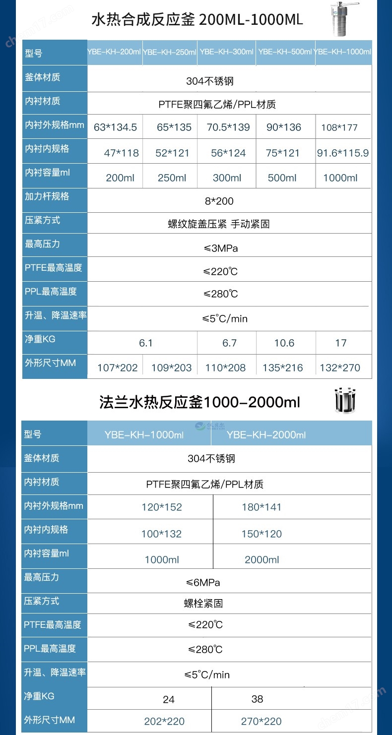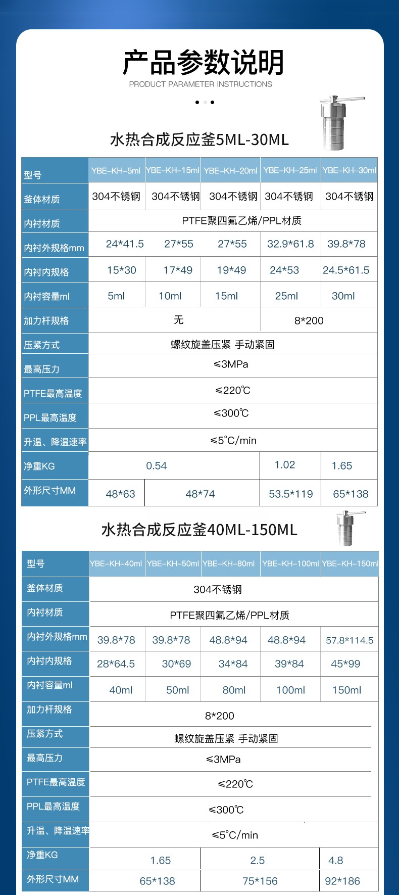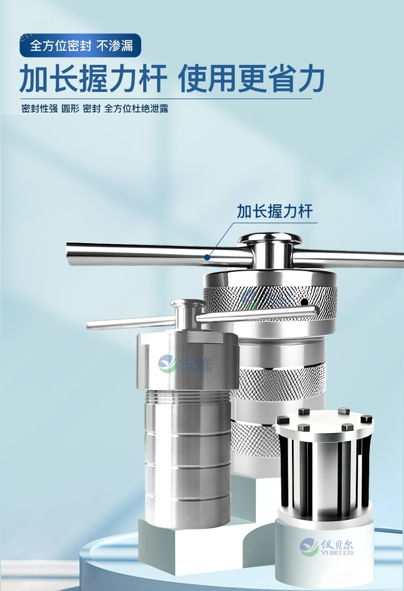 外壳材料国标304不锈钢内衬材料 PTFE 聚四氟乙烯材质耐压 3Mpa 温度设计温度220℃ 使用安全温度200℃ 规格 2ml3ml5ml10ml15ml25ml35ml50ml100ml150ml200m l250ml300ml500ml1000ml2000ml 非标可定制